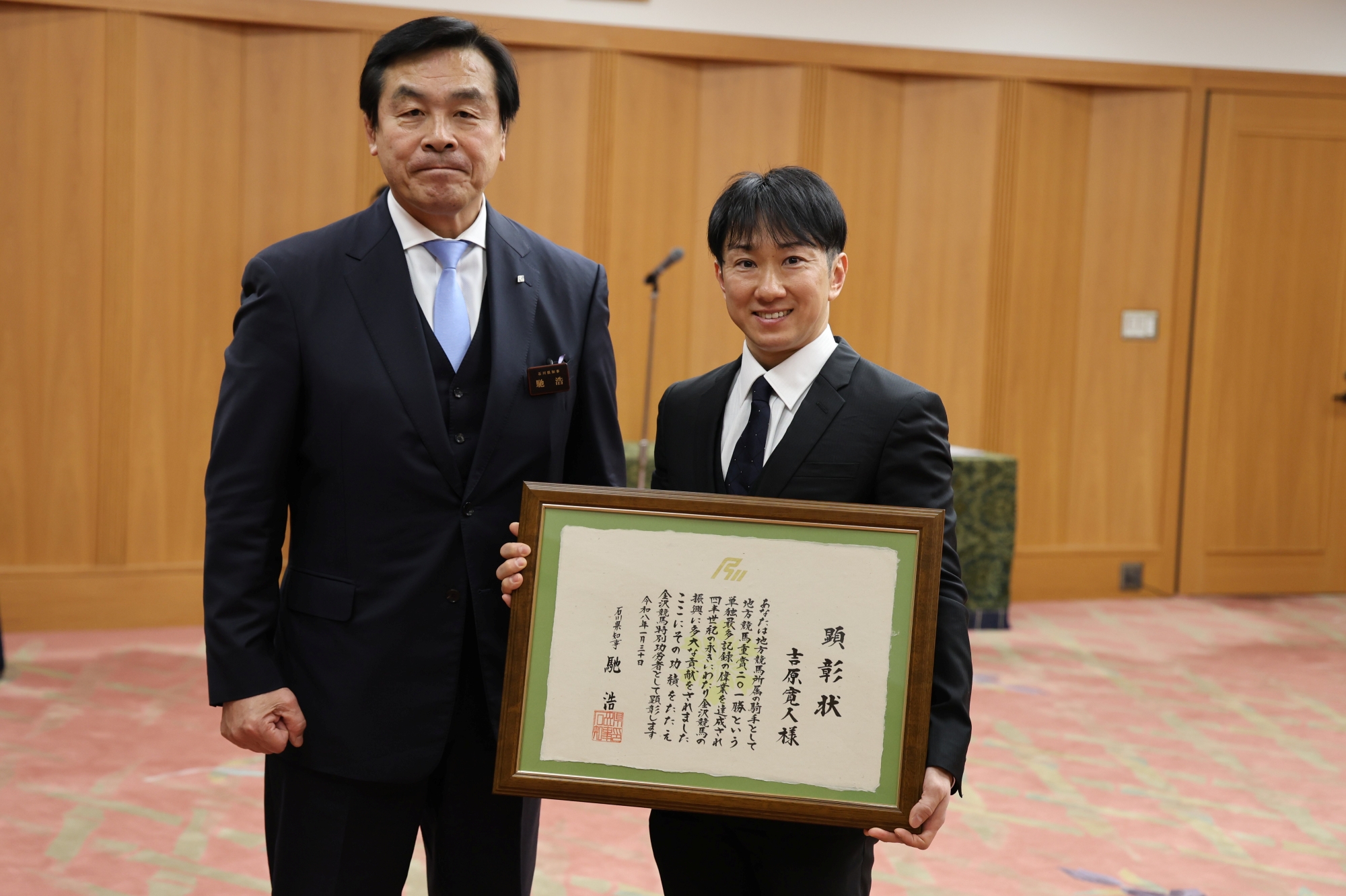 本日(令和8年1月30日)、金沢競馬特別功労者顕彰式が行われ、地方競馬所属騎手として地方競馬重賞201勝の最多記録の偉業を達成した吉原寛人騎手に対し、馳浩知事より顕彰状、記念品が贈呈されました。